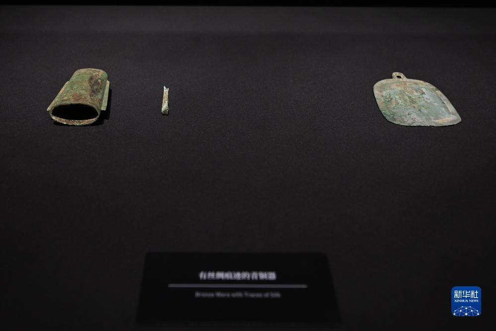 这是7月26日在三星堆博物馆新馆拍摄的有丝绸痕迹的青铜器。新华社记者 王曦 摄