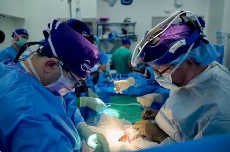 杰弗里·斯特恩医学博士(左)和罗伯特·蒙哥马利医学博士(右)准备将转基因猪肾植入腹部。图片来源:乔·卡罗塔/纽约大学朗格尼健康中心