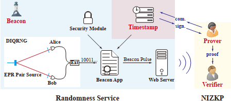 研究团队曾于2018年在国际上首次实现可抵御量子攻击的器件无关量子随机数,随后于2021年提升了随机数产生速度。在此次研究工作中,研究团队搭建了一个基于器件无关量子随机数的信标公共服务系统,并利用该系统设计并实施了一种不依赖于真随机数假设的非交互式零知识证明方案。该随机数信标服务可以实时向公众广播生成的随机数。此外,为确保随机数在广播过程中的安全性,研究团队还采用了可以抵御量子攻击的量子安全签名算法。随后,研究团队利用接收到的器件无关量子随机数代替之前的伪随机数,构建并实验验证更安全的非交互式零知识证明协议。