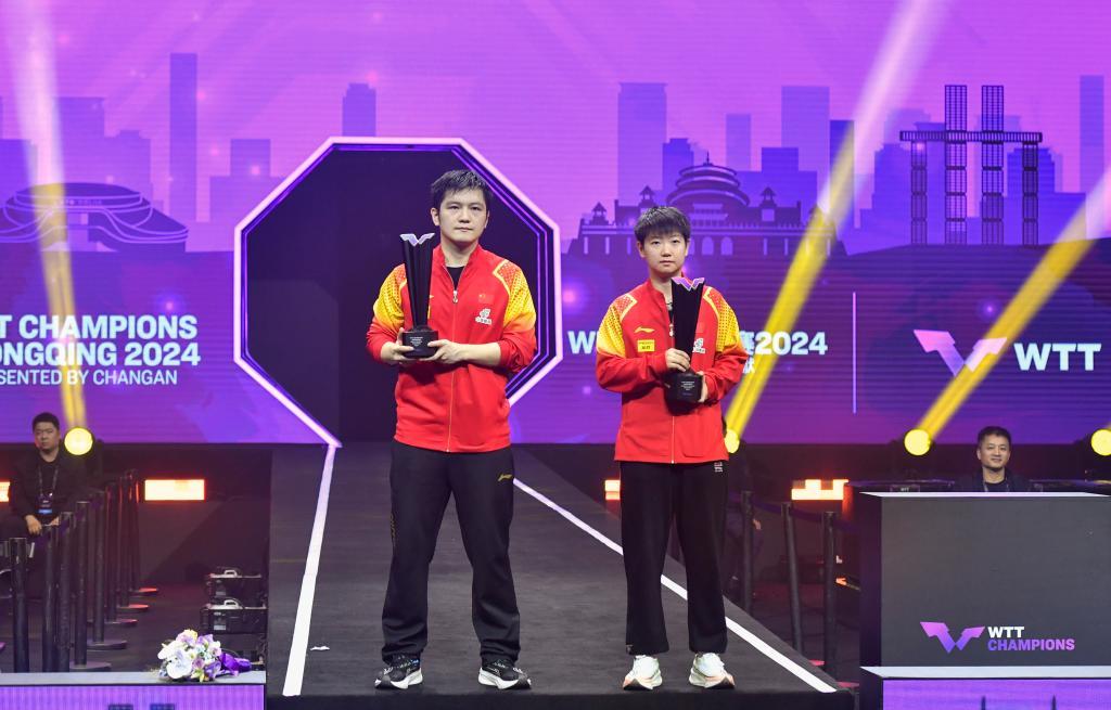 新华社重庆6月3日电(记者谷训)3日,中国国乒选手孙颖莎、樊振东均以4:3战胜队友,分别夺得2024年世界乒乓球职业大联盟(WTT)重庆冠军赛女单和男单冠军。