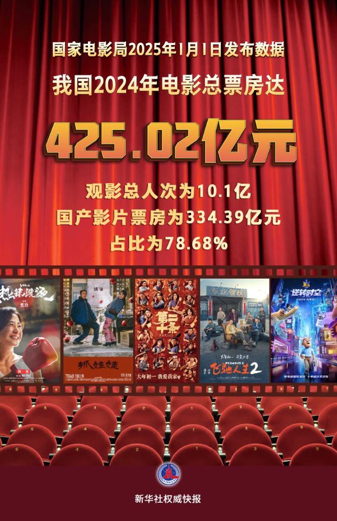 新华社北京1月1日电,国家电影局1日发布数据,中国2024年电影总票房达425.02亿元,观影总人次为10.1亿。其中,国产影片票房为334.39亿元,占比为78.68%。