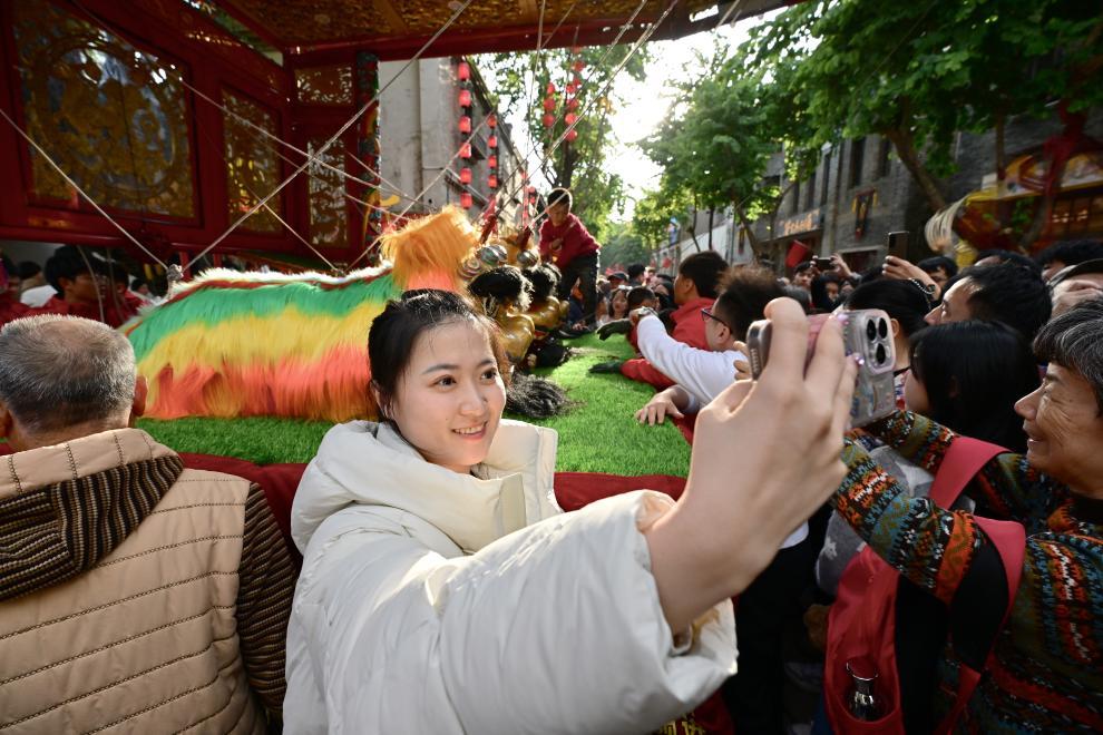 1月30日,福州市上下杭历史文化街区,一位女孩与少年线狮队表演道具合影。