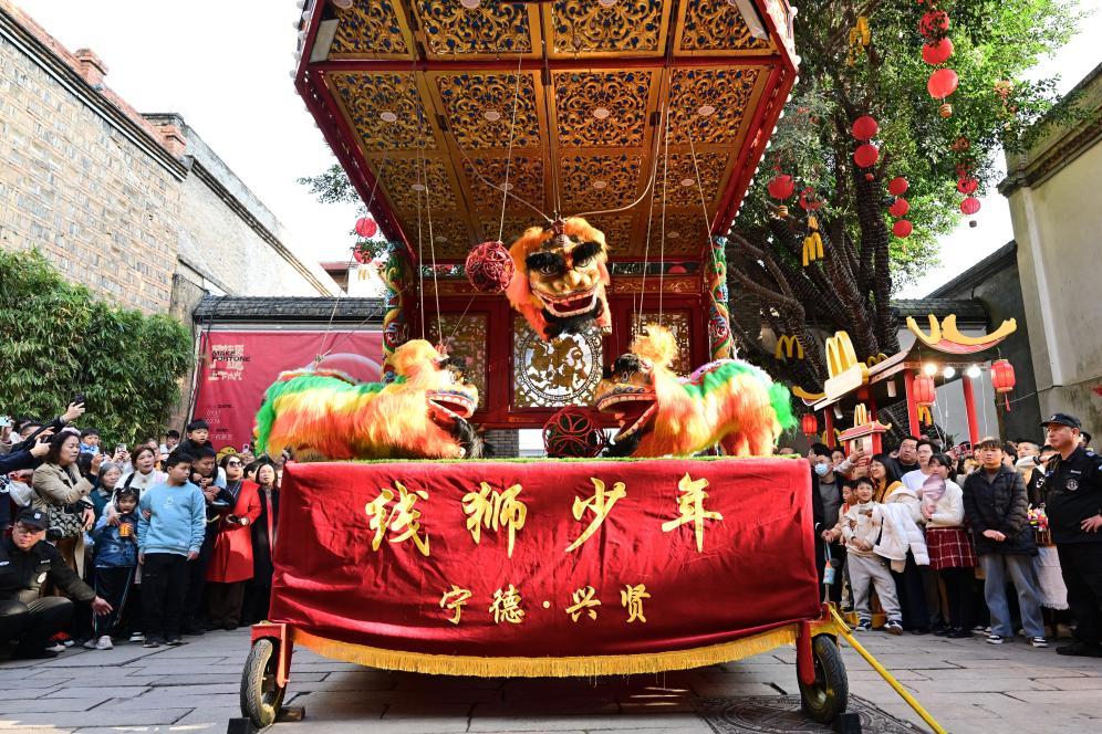 1月30日,兴贤少年线狮队在福州市上下杭历史文化街区表演。