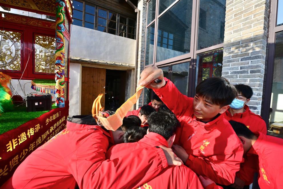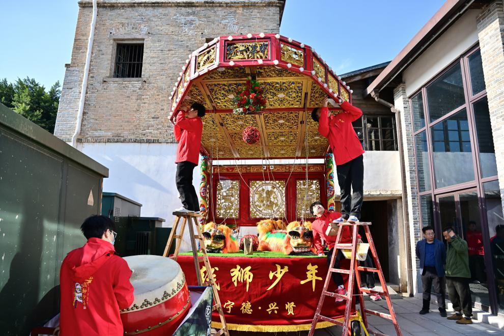 1月30日,福州市上下杭历史文化街区,受邀前来参加新春非遗表演活动的兴贤少年线狮队在演出前准备。