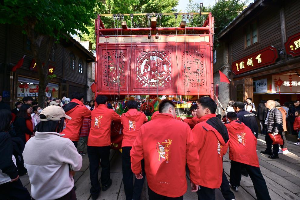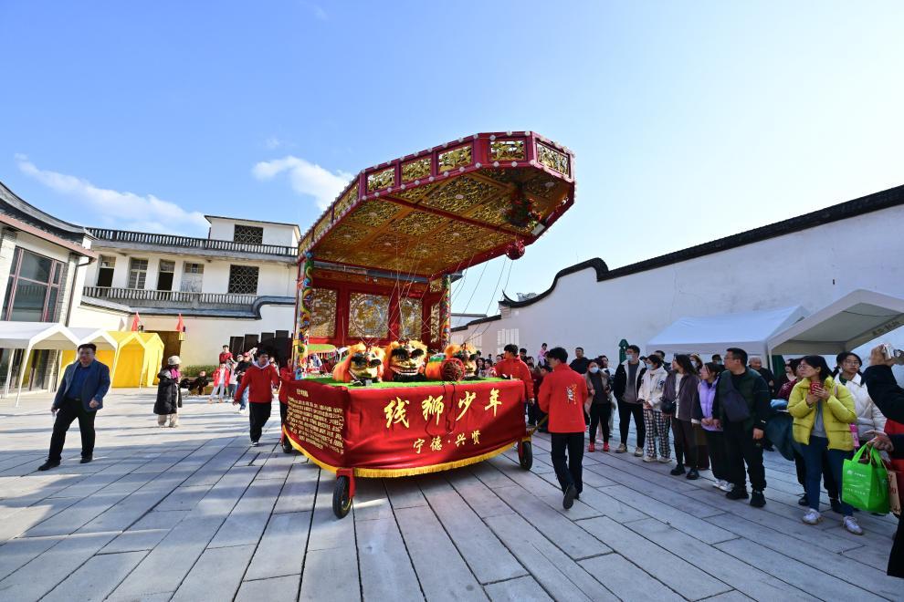 1月30日,福州市上下杭历史文化街区,受邀前来参加新春非遗表演活动的兴贤少年线狮队在演出后推着道具游街。