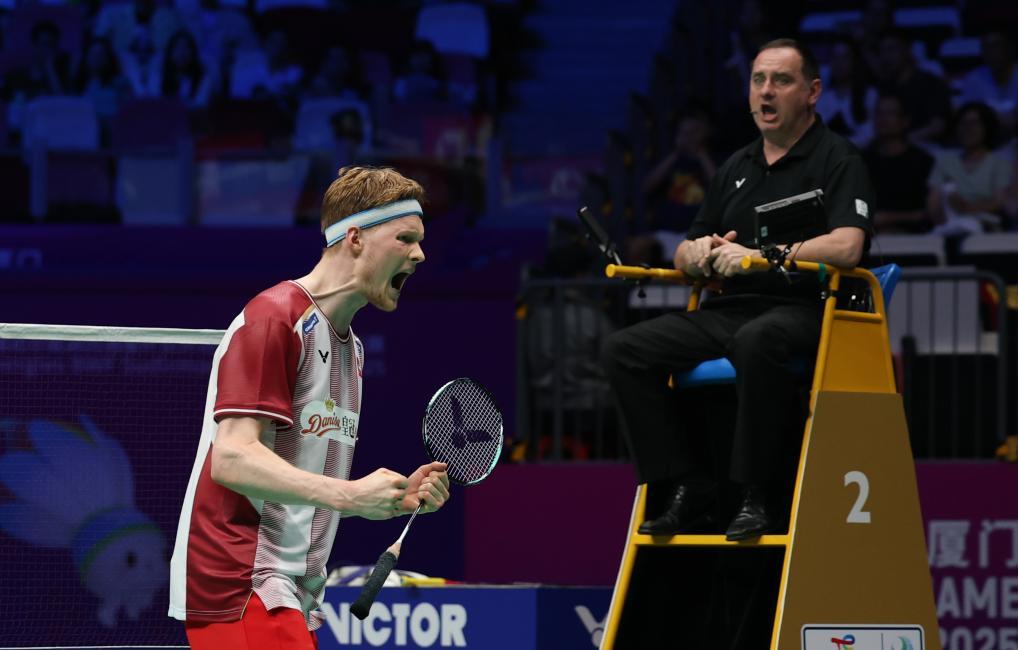 5月2日,丹麦队选手安东森(左)在男单比赛获胜后庆祝。新华社记者 王楷焱 摄