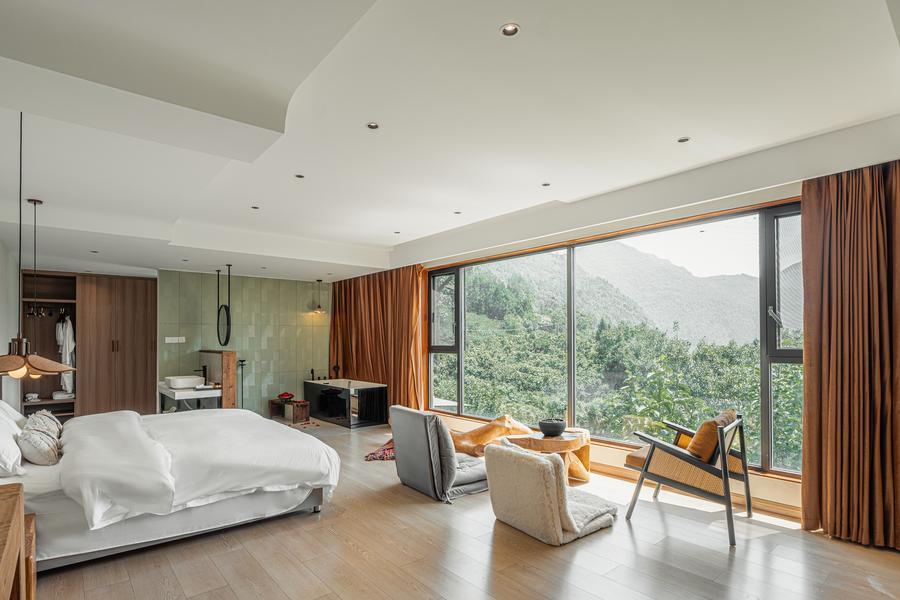 走进房间,只见落地玻璃窗外风景如画。房间内正对风景的,是席地的软靠,纯木的摆件。还有触感舒适的床品,淡雅隐约的香氛,可观景的浴缸……榜样有了,十余处精心打造的民宿跟着建成,拉动了供给升级。