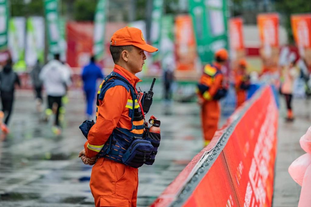 “黄马”期间,2600多名安保人员和志愿者,构建“起点管控—沿线巡逻—终点疏导”的安保体系。组委会还在赛道沿途设置了28个医疗站点,配备了35台AED除颤仪及24辆救护车,并每200米设一名医疗观察员,组成“分钟级响应”团队。