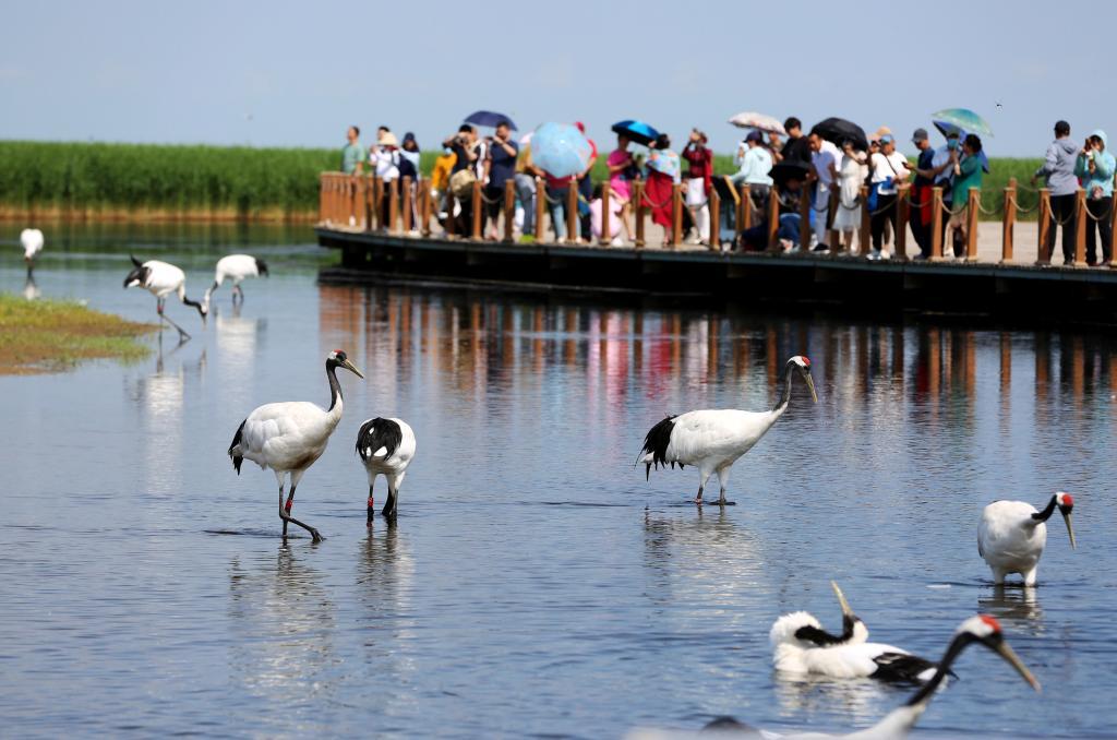游客在扎龙国家级自然保护区观赏丹顶鹤(2023年6月28日)。新华社记者 石枫 摄