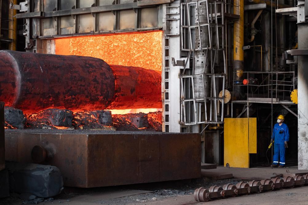 中国一重集团铸锻钢事业部水压机锻造厂车间内,一件重量超600吨的钢坯被烧得通红,正在1.5万吨自由锻造水压机上进行锻造。操作这庞然大物的,是大国工匠、中国一重集团铸锻钢事业部水压机锻造厂副厂长刘伯鸣。