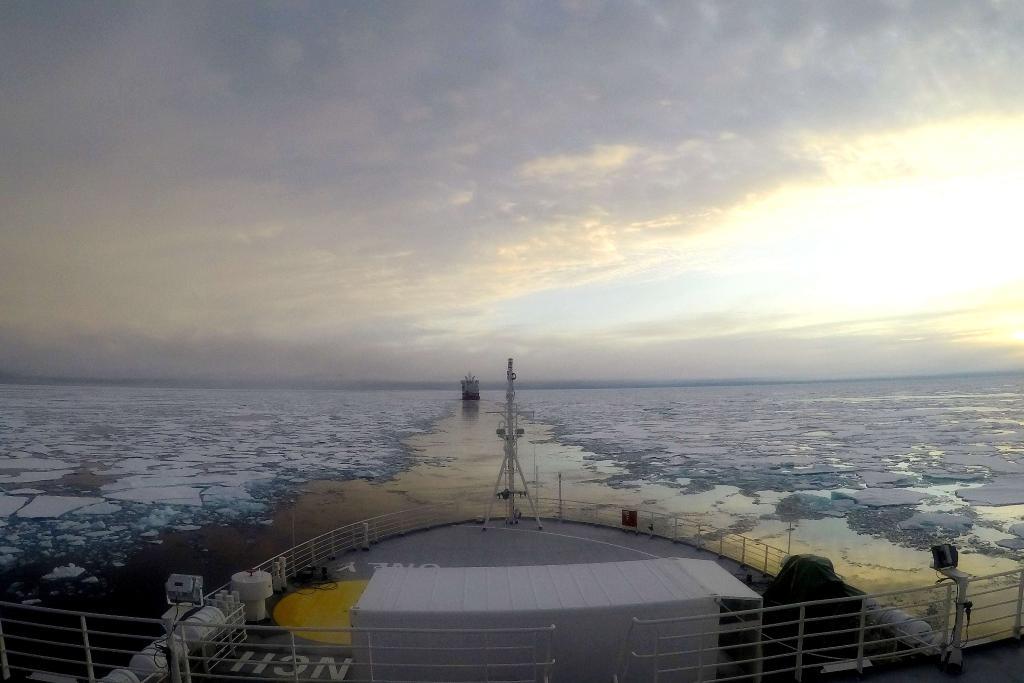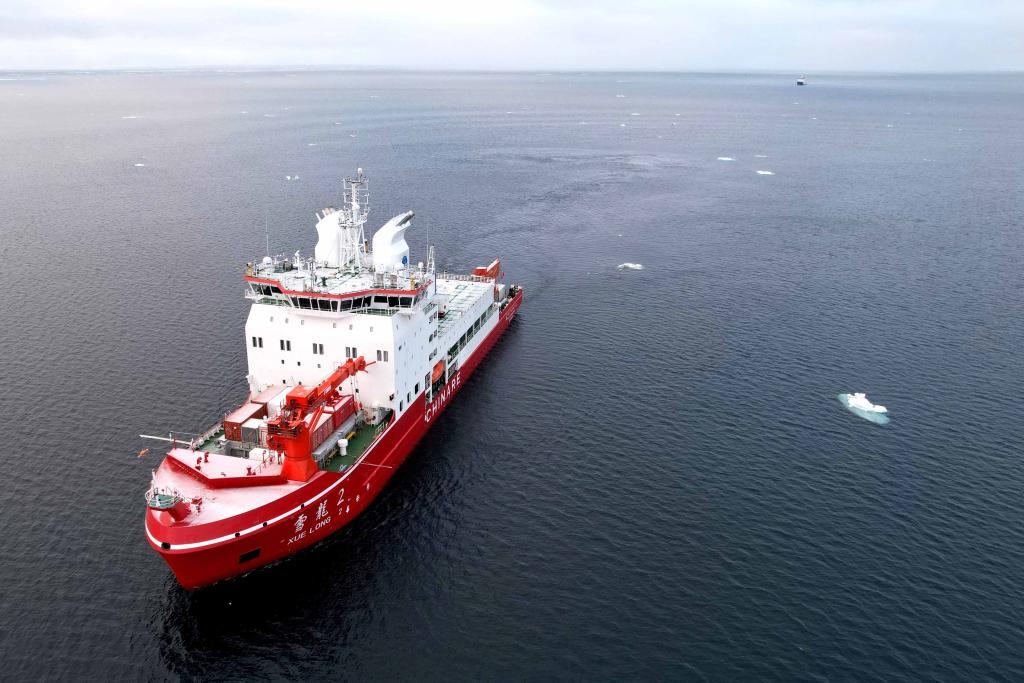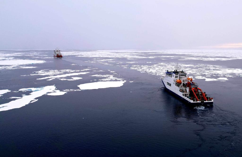 8月4日中午,已经在北冰洋开展科考多日的“雪龙2”号结束阶段性作业,离开海冰密集度非常高的海域,与从国内来到北冰洋冰区的“深海一号”汇合。