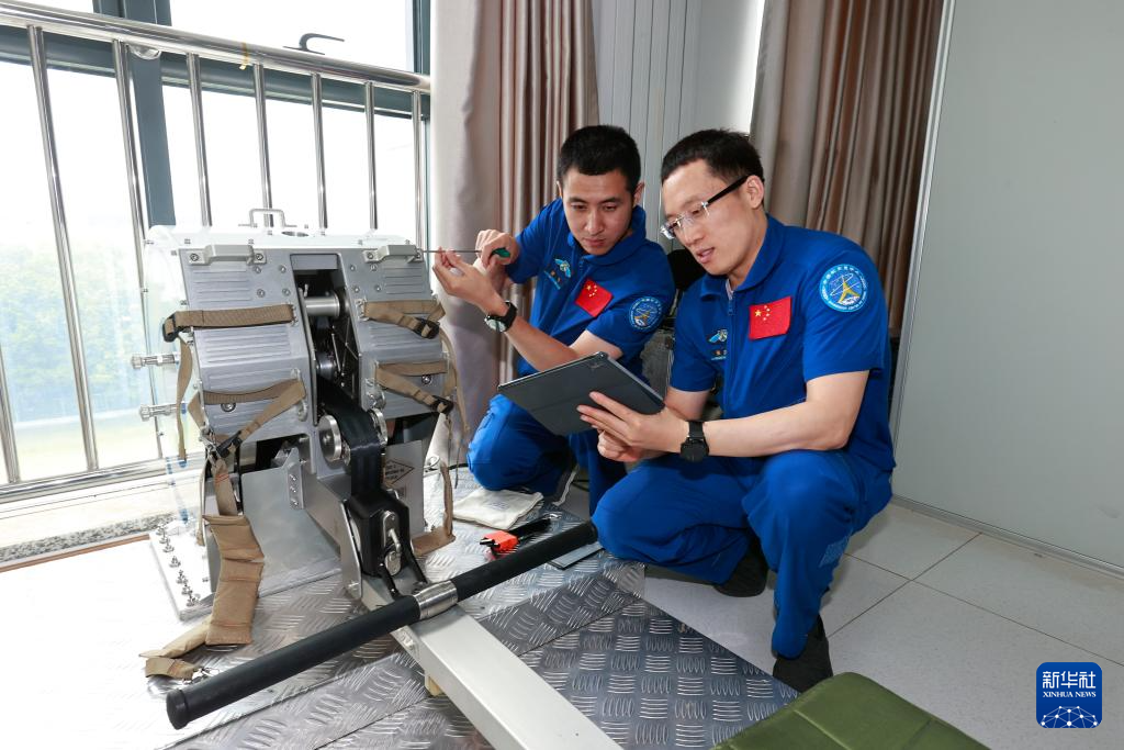 武飞(左)、张洪章在核心舱模拟器训练(2025年6月9日摄)。新华社发(徐部 摄)