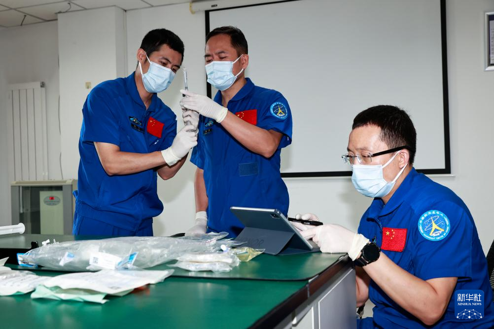 武飞(左)、张陆(中)、张洪章进行植物培养训练(2025年8月28日摄)。新华社发(徐部 摄)
