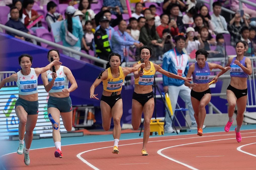 图为11月15日拍摄的第十五届全国运动会田径项目4×100米混合接力预赛。新华社记者 李一博 摄
