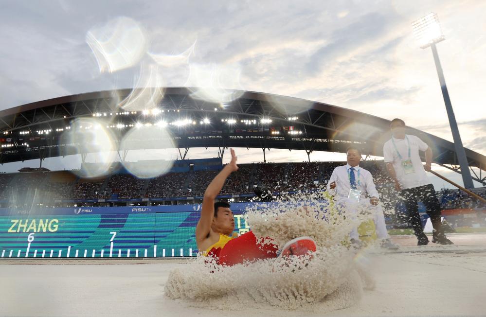 8月6日,张景强(左)在比赛中。当日,在成都大运会男子跳远决赛中,他以7米93的成绩获得金牌。新华社记者 贾浩成 摄