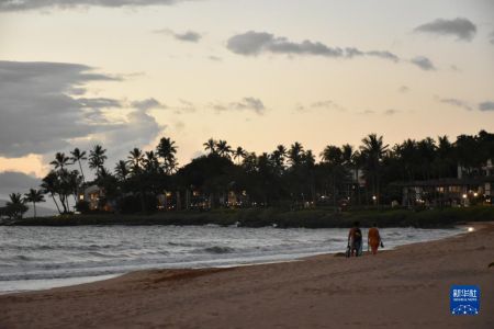 8月23日,两名游客在美国夏威夷毛伊岛一处海滩观景。