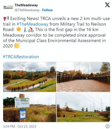 据blohgTO报道,人们期待这个变革性意义的发展项目已经有超过五年的时间。现在居民们可以参观这个16公里长的线性公园的一个新建成部分,它在上周刚刚向公众开放。多伦多和区域保护局(TRCA)于上周一剪彩,为这个走廊上现已完工的部分园区揭幕。它是一条全新的多功能步道,目前开放的TheMeadoway部分会从士嘉堡的Military Trail一直延伸到Neilson Road。