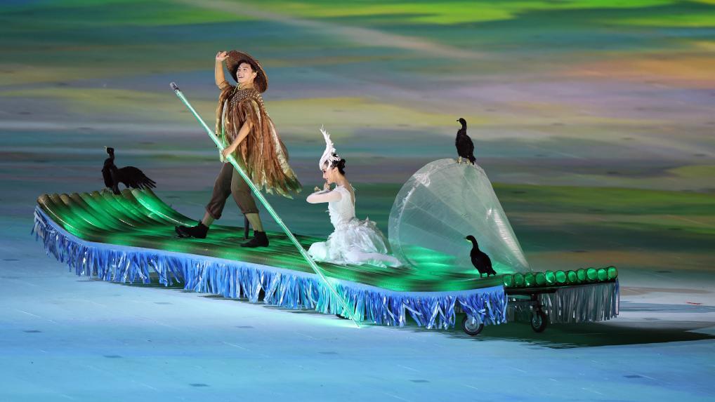 “唱山歌嘞,这边唱来那边和……”蓦然间,空灵的山歌在场馆上空响起。开幕式在壮乡山歌中徐徐拉开。