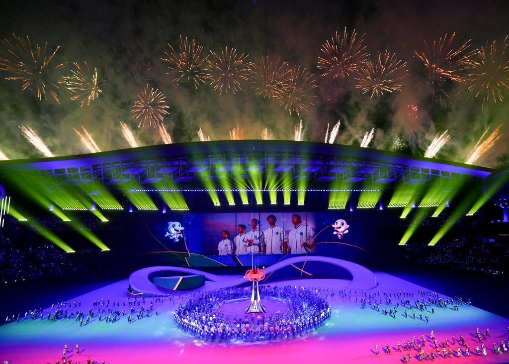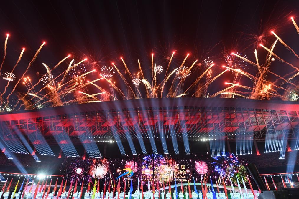 璀璨的烟花在体育场上腾空而起,绽放出的“青春万岁”格外夺目。(新华社记者农冠斌、陈露缘、赵建通)