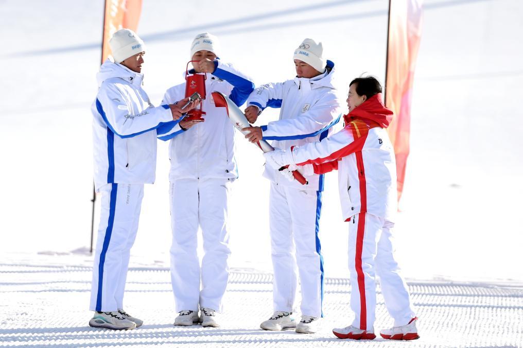 2022年2月3日,北京冬奥会火炬在河北张家口崇礼富龙滑雪场传递,图为火种护卫点燃火炬手刘芳(右一)的火炬。新华社记者骆学峰摄