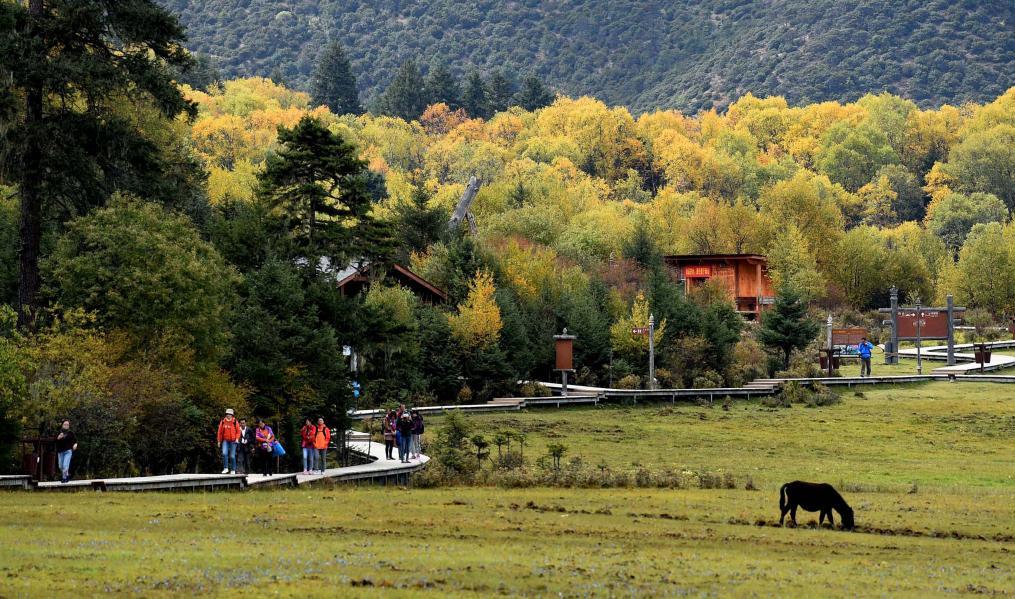 游人在云南迪庆州普达措景区里游览。新华社记者 蔺以光 摄