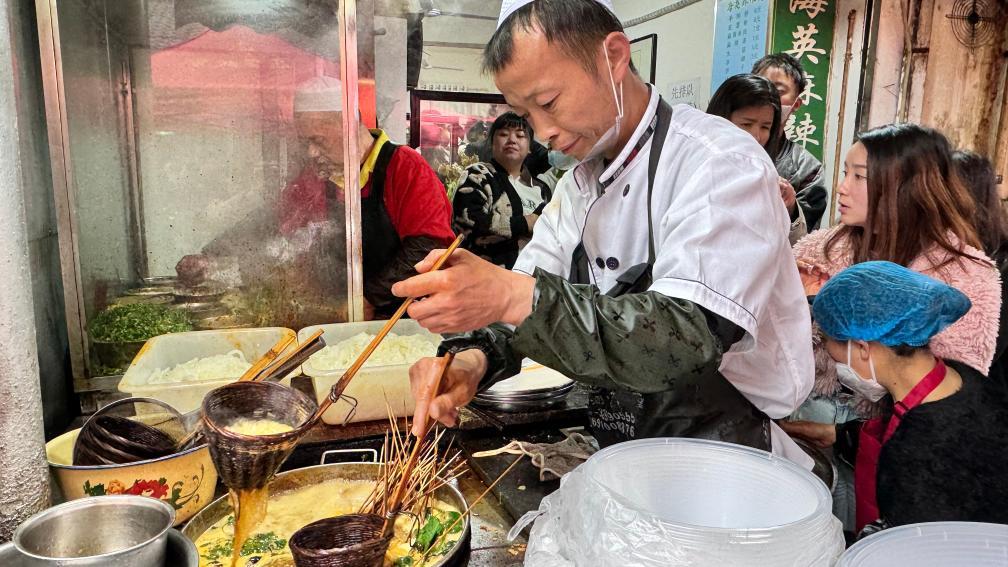 清晨6点多,天水市秦州区文庙旁的小院里已经排起长队。当红“打卡点”海英麻辣烫店内,10多位店员切菜、串菜忙个不停。“现在每天接待700多人,夜宵成正餐了。”老板娘哈海英哑着嗓子说。