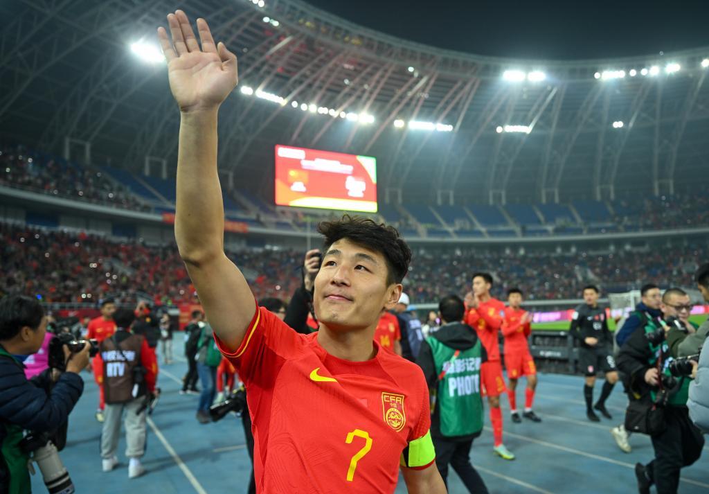 3月26日,中国队球员武磊在比赛后向球迷致意。当日,在天津举行的2026年国际足联世界杯亚洲区预选赛36强赛C组比赛中,中国队主场4比1战胜新加坡队。新华社记者 孙凡越 摄