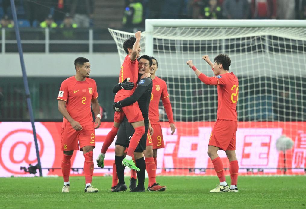 3月26日,中国队守门员王大雷(左三)与中国队球员韦世豪(左二)庆祝得分。新华社记者 孙凡越 摄