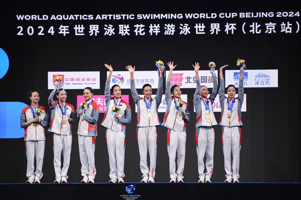 4月5日,冠军中国队在颁奖仪式上。当日,在2024年花样游泳世界杯(北京站)集体技术自选比赛中,中国队以250.2686分的成绩夺得冠军,澳大利亚队以229.1117分的成绩获得亚军,哈萨克斯坦队以208.6020分的成绩获得季军。新华社记者 鞠焕宗 摄