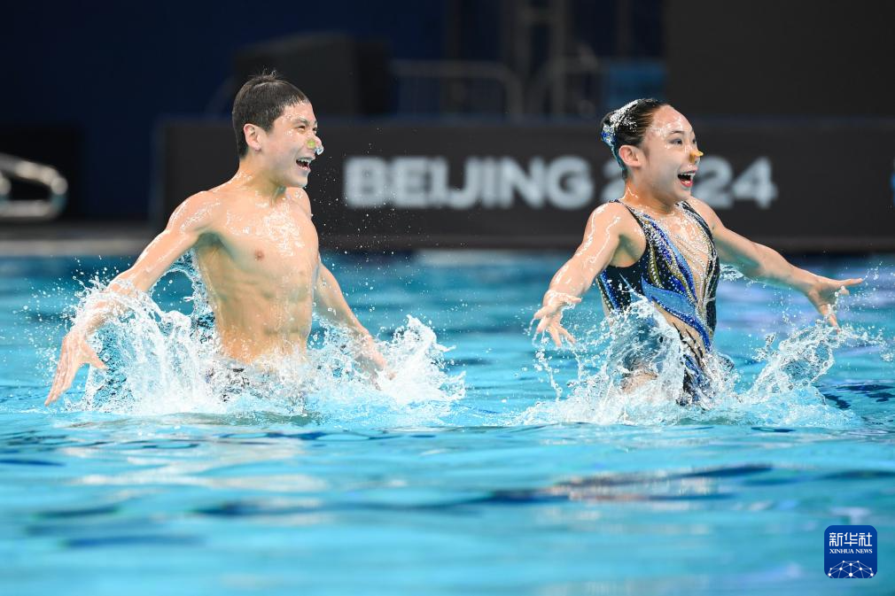 4月5日,季荷悦/郭牧也(左)在比赛中。当日,在2024年花样游泳世界杯(北京站)混合双人技术自选比赛中,中国组合季荷悦/郭牧也以206.8800分的成绩夺得冠军。新华社记者 鞠焕宗 摄
