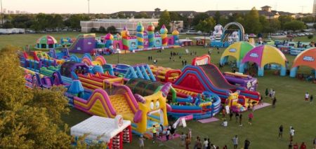 世界上最大的充气城堡高 32 尺,面积 16,000 平方尺,亦有巨型滑梯、篮球框、攀爬塔、球坑、超大的沙发等等。还有一只 20 尺高的彩色兔子,可以爬进去。至于体育方面,可以期待有一个定制的充气体育场馆,里面有来自您最喜欢的所有地点的球门、网、篮球架和球。