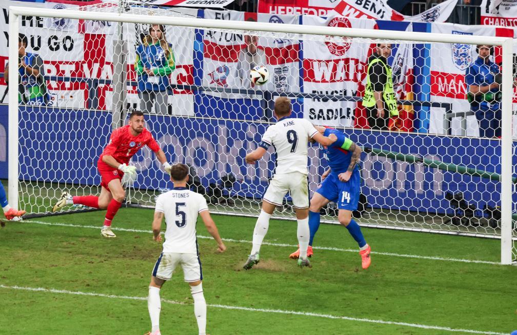 6月30日,英格兰队球员凯恩(右二)头球攻门得分。当日,在德国盖尔森基兴进行的2024年欧洲足球锦标赛八分之一决赛中,英格兰队2比1战胜斯洛伐克队,晋级八强。新华社记者 张帆 摄