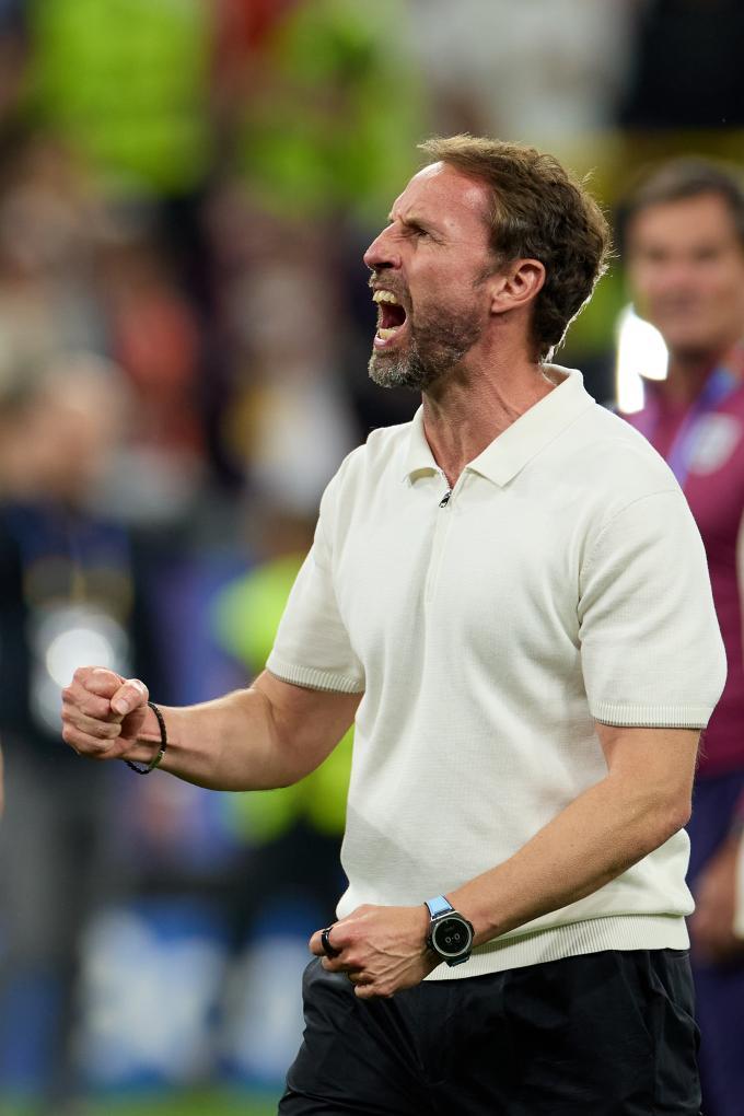 7月10日,英格兰队主教练索斯盖特在比赛后庆祝胜利。新华社记者 孟鼎博 摄