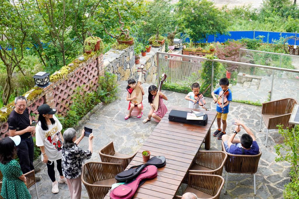 在荆竹村一家民宿内,游客在小院里休闲娱乐。(2020年7月30日摄)新华社记者 刘潺 摄