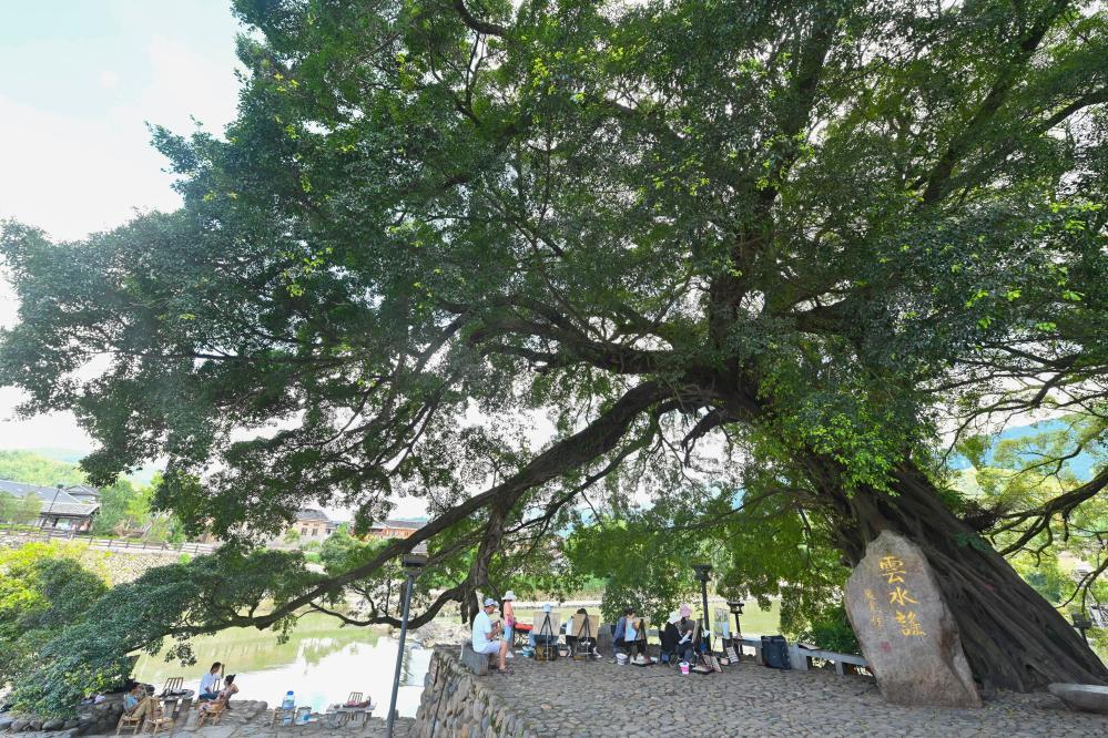 在官洋村云水谣景区,学生和游客在榕树下写生(2021年8月17日摄)。新华社记者 宋为伟 摄