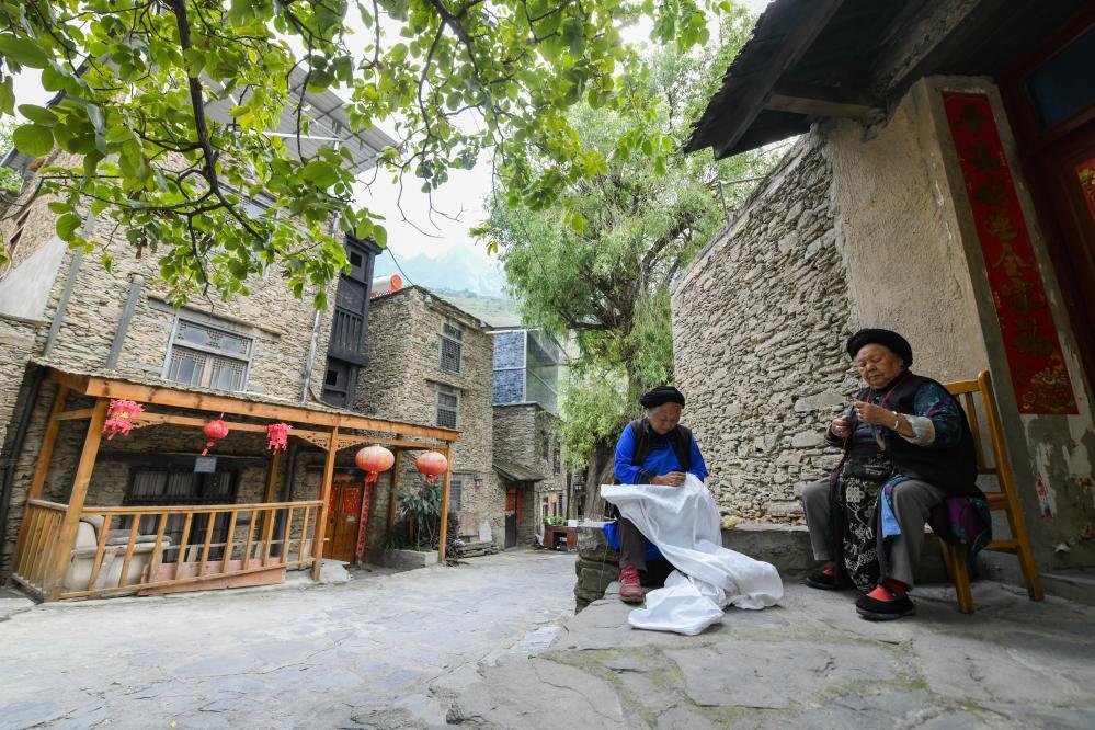 在桃坪村,羌族村民在自家房屋前做针线活(2023年9月13日摄)。新华社记者 王曦 摄