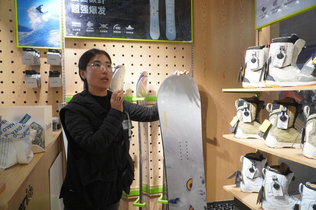 位于吉林省北大湖滑雪度假区的国产滑雪装备品牌Overide门店内,店长贾晓娜在介绍滑雪板性能。新华社记者孙逸轩 摄