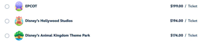 根据迪士尼世界官网显示,2025年12月31日的单日单园门票价格,视游玩的园区不同,范围在174美元至199美元(约242至277加元)。