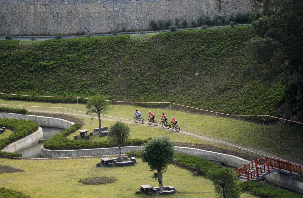 10月28日,参赛选手在比赛中。当日,第一届全国学生(青年)运动会男子山地自行车越野赛在广西南丹县举行,贵阳市代表队选手王胜以1小时4分36秒夺得冠军,遵义市代表队选手文灵浩以1小时4分38秒获得亚军,成都市代表队选手解道超以1小时5分12秒获得季军。新华社记者 陆波岸 摄