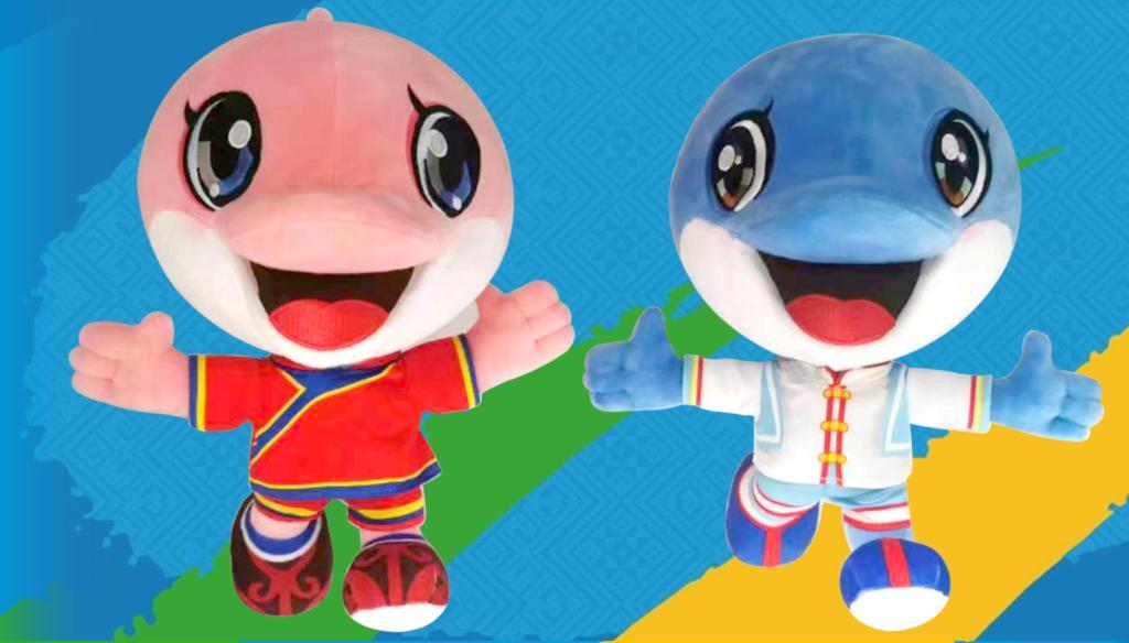 图为学青会吉祥物——中华白海豚“壮壮”和“美美”