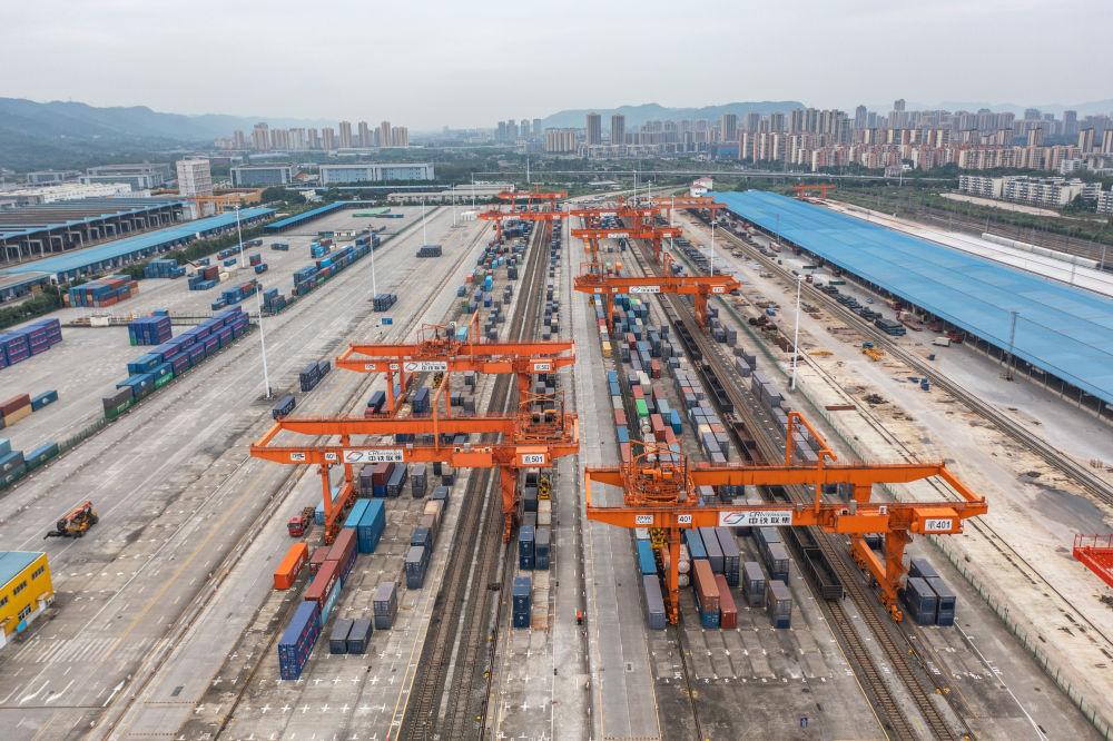 位于重庆市沙坪坝区的团结村中心站,“国际范儿”十足。一边是运载着全新整车的班列从德国运抵,一边是装载着国产新能源汽车的集装箱等待“出海”……