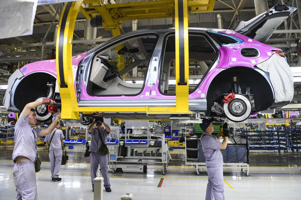 赛力斯汽车有限公司重庆两江智慧工厂工作人员在生产车间作业(2022年6月27日摄)。新华社记者 王全超 摄