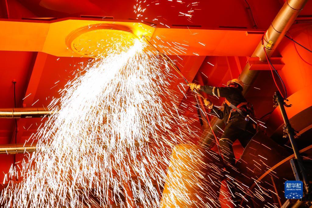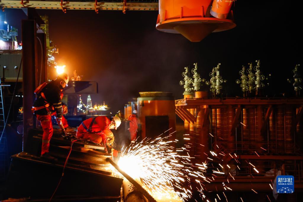 11月4日,工人在埕北油田中心平台作业现场进行切割作业。新华社发(杜鹏辉摄)