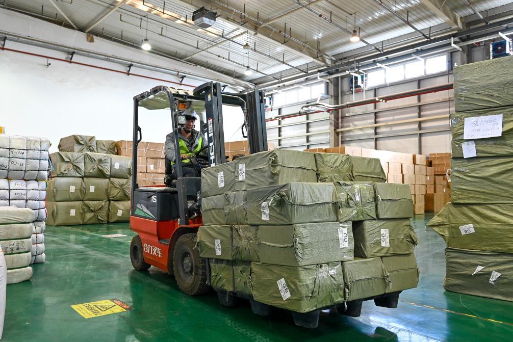 11月4日,在新疆喀什综合保税区内的中顺电子跨境电商货物分拣中心,工作人员在转运出口的货物。新华社记者丁磊 摄
