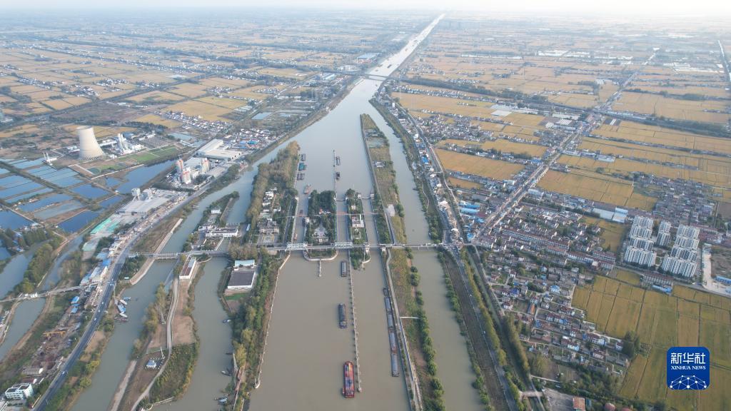 船只行驶在京杭大运河上(无人机照片,2023年10月29日)。新华社记者 刘诗平 摄