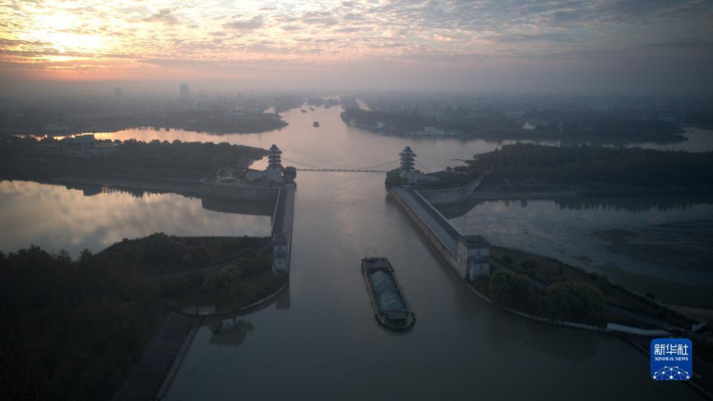 淮安水利枢纽一隅(无人机照片,2023年10月28日)。从左至右分别是淮安引江闸、第三抽水站、船闸、沙庄引江闸。新华社记者 刘诗平 摄