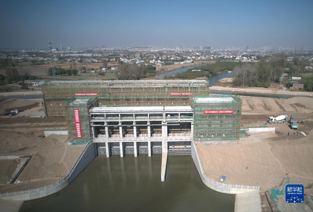 淮河入海水道二期工程盐城段张家河闸站主体工程(无人机照片,2023年10月29日)。新华社记者 刘诗平 摄