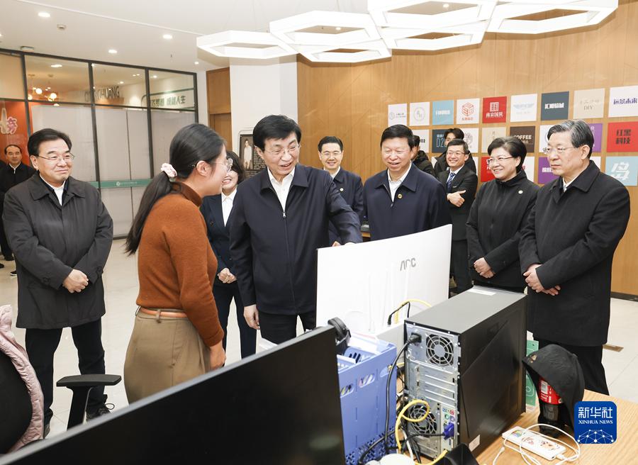 11月14日,2023两岸企业家峰会10周年年会开幕式在南京举行。这是开幕式前一天,中共中央政治局常委、全国政协主席王沪宁考察南京台湾青年创业学院。新华社记者 庞兴雷 摄