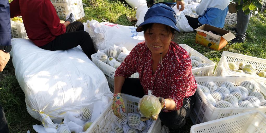 在山西省汾西县团柏乡的千亩梨园里,果农们分拣新采摘的玉露香梨。新华社记者王飞航 摄
