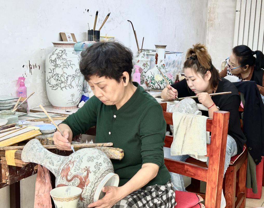 走进天津市粉彩瓷器制作技艺传承人王作彬的工作室,10余位匠人正手握画笔,聚精会神创作以杨柳青年画为题材的雕瓷或瓷板。“年画从纸上‘搬’到粉彩瓷上,很多人是慕名来参观选购。”王作彬说。如今,村里不少人在王作彬的带领下,悉心学习技艺,走上了致富道路。